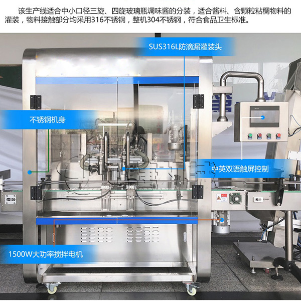 下面就來(lái)介紹一家具有數(shù)十年生產(chǎn)經(jīng)驗(yàn)的豆瓣醬灌裝機(jī)生產(chǎn)廠家。山東迅捷機(jī)械制造有限公司是一家專(zhuān)業(yè)豆瓣醬灌裝機(jī)生產(chǎn)廠家,灌裝產(chǎn)品可廣泛適用于各種含顆粒的半流體、膏體、醬料的灌裝,也可灌裝各種粘稠醬體等。配自動(dòng)攪拌功能,結(jié)構(gòu)簡(jiǎn)單、精確度高、操作更加簡(jiǎn)便,灌裝閥由氣動(dòng)閥控制,豆瓣醬灌裝機(jī)灌裝精度更高,灌裝量和灌裝速度均可任意調(diào)節(jié),灌裝悶頭采用防拉絲及升降灌裝裝置,物料接觸部分均采用316L不銹鋼材料制成,符合GMP要求。豆瓣醬灌裝機(jī)滿(mǎn)足各種場(chǎng)地機(jī)灌裝產(chǎn)品需求。