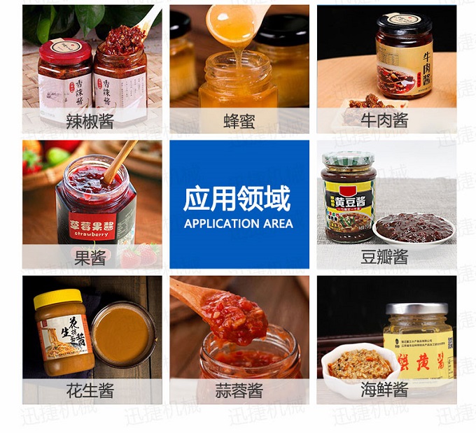 醬料灌裝機(jī)采用活塞式灌裝原理,適用于調(diào)味品中帶顆粒并且濃度較大的辣椒醬、豆瓣醬、花生醬、香菇醬、果醬、牛油火鍋底料、紅油火鍋底料、蝦醬等較為粘稠醬類的灌裝。