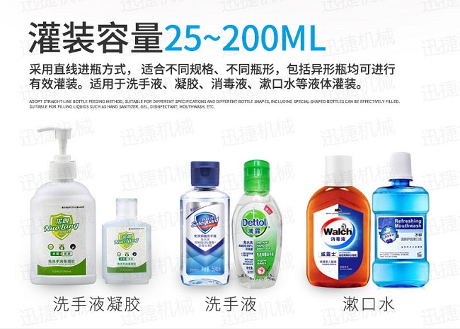 我們的雙手需要接觸的物品是在太多,在我們不能確定手是否清潔時要避免用手接觸口鼻和眼睛,這樣做還是有好處的,大大降低了病毒入侵我們的身體。洗手是相當有必要的,其使用免洗手消毒液洗手那更是萬全之策,然而我們迅捷機械研發(fā)生產(chǎn)出免洗手消毒液灌裝生產(chǎn)線,自動化消毒液灌裝生產(chǎn)線是為市場對年洗手消毒液的需求而研發(fā)誕生的,該設備自動化程度高,性能穩(wěn)定,生產(chǎn)速度快,灌裝準確,操作簡單、調(diào)整方便,適應性強等特點,免洗手消毒液灌裝生產(chǎn)線是相關行業(yè)必備的現(xiàn)代化灌裝機械設備。